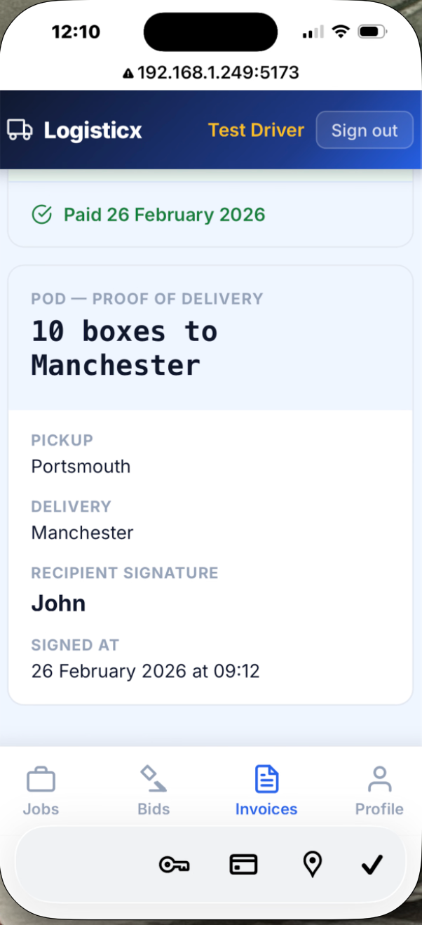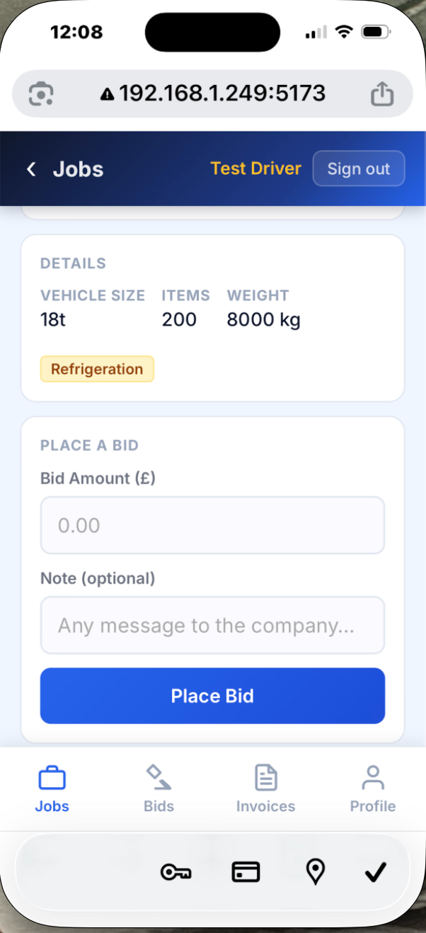 Logistics marketplace platform, designed to connect courier and freight companies with independent drivers across the UK. The platform eliminates the inefficiency of informal job allocation by providing a structured digital exchange where companies post delivery jobs, drivers compete through a transparent bidding system, and both parties manage their financial records in one place.